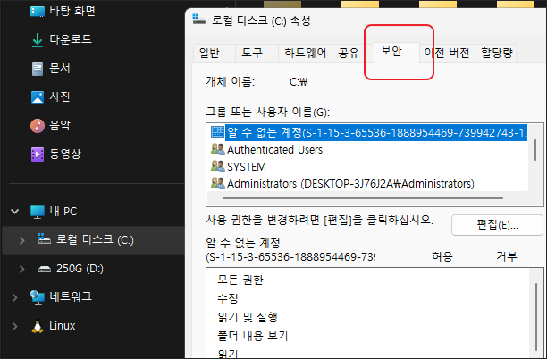 다음으로 보안 탭을 선택해 줍니다.