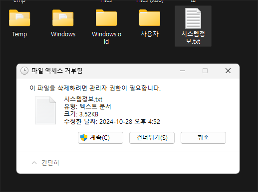 윈도우 메인 관리자 계정으로 로그인되어 있는 상태인데도 불구하고 시스템 파일이 아닌 일반 파일을 C 드라이브에서 삭제하고자 하는 경우 '파일 액세스 거부됨', '이 파일을 삭제하려면 관리자 권한이 필요합니다.' 등의 경고창이 뜨며 이를 한번 더 클릭해야 비로소 삭제가 가능한 경우가 있습니다.