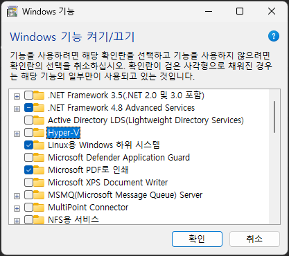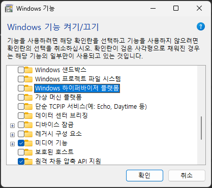 - Windows Subsystem for Linux (WSL 2): WSL 2는 Hyper-V 기술을 기반으로 작동하므로, Hyper-V를 비활성화하면 WSL 2를 사용할 수 없습니다.