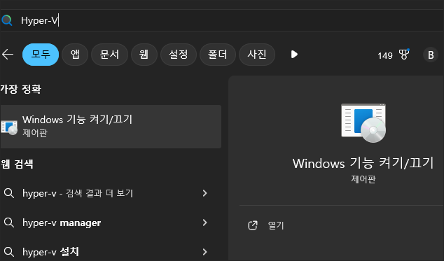 첫 번째는 간단한 방법으로 윈도우 시작 버튼을 누르고 Hyper-V라고 입력한 다음 Windows 기능 켜기/끄기 열기를 클릭해 작업을 진행하는 방법입니다.