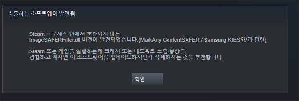 Steam 프로세스 안에서 호환되지 않는 ImageSAFERFilter.dll 버전이 발견되었습니다.(MarkAny ContentSAFER / Samsung KIES와 관련)