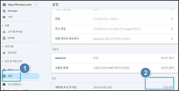 다음으로 구글 서치 콘솔에 등록된 속성 전체를 제거해 주려면 해당 속성이 선택된 상태에서 좌측의 하단 메뉴중 설정을 클릭하고 우측에서 속성 제거를 클릭해 주면 됩니다.
