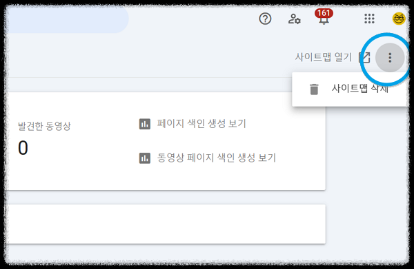 구글 서치 콘솔 사이트로 이동한 다음 사이트맵을 클릭하면 단독 페이지로 넘어가는 데, 이때 우측 상단의 3점을 클릭하고 사이트맵 삭제를 눌러 주면 됩니다.