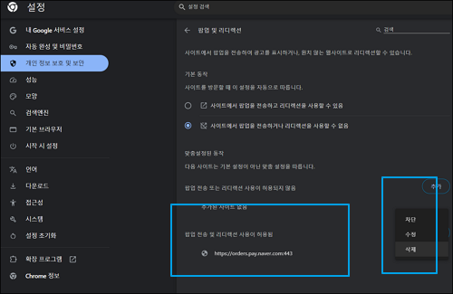 팝업 전송 및 리디렉션 사용이 허용된 항목의 우측 3점을 클릭하고 허용된 항목을 삭제합니다.