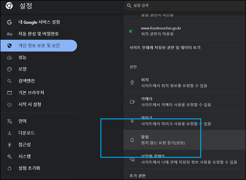 구글 크롬의 설정 > 개인 정보 보호 및 보안으로 들어간 다음 우측에서 사이트 설정을 클릭합니다.
