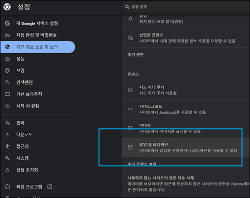 1. 허용된 팝업 및 리디렉션 삭제