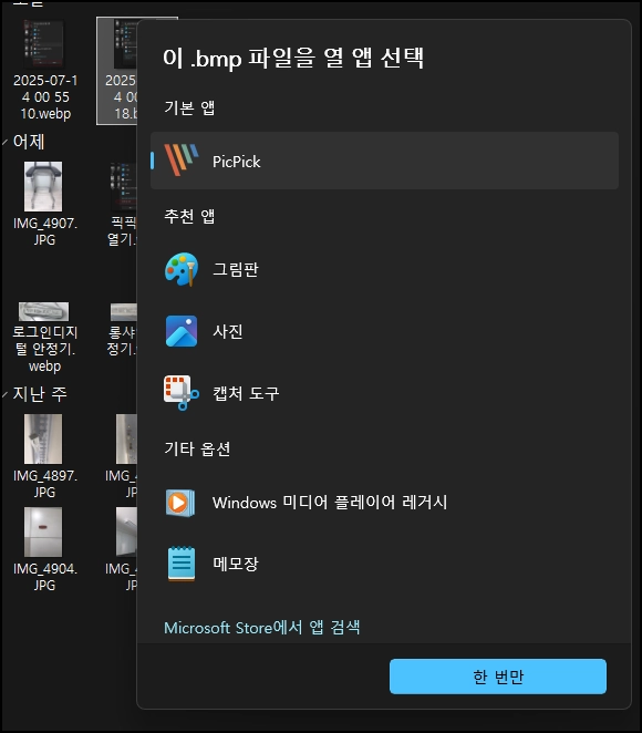 예를 들어 위의 이미지 파일은 WebP 확장자 형식으로 이미 항상 열리도록 설정 작업을 진행해 주었기 때문에 한번 만이라는 버튼만 보이고 있습니다. 그러나 동일한 이미지라도 이미지의 확장자가 bmp라면 이 이미지의 연결 프로그램을 눌렀을 경우에 두개의 버튼이 모두 보이고 있습니다. bmp 이미지 확장자의 경우에도 항상 원하는 프로그램이 열리도록 설정하려면 최초 한번은 항상으로 설정해 주어야 합니다.