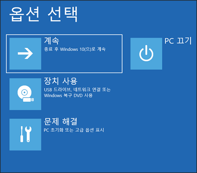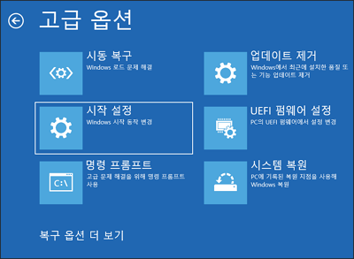 키보드의 Shift 버튼을 누르고 있는 상태에서 마우스로 윈도우 로고를 클릭한 다음 재시작 버튼을 클릭해 주면 파란색의 윈도우 복구 모드로 진입할 수 있습니다.