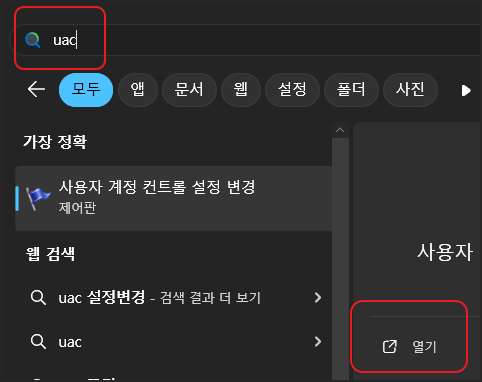 윈도우 시작 버튼을 누르고 검색란에 UAC라고 입력한 다음 UAC 열기를 클릭합니다.