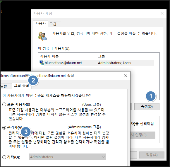 좀 전에 윈도우에 로그인해 있던 계정을 찾은 다음 속성 버튼을 누른 다음 그룹 등록 탭을 선택하고 관리자를 선택한 다음 적용 및 확인 버튼을 눌러 줍니다. 이렇게 적용 및 확인 과정을 모두 마치면 좀 전의 윈도우 계정에 관리자 권한이 부여되게 됩니다.