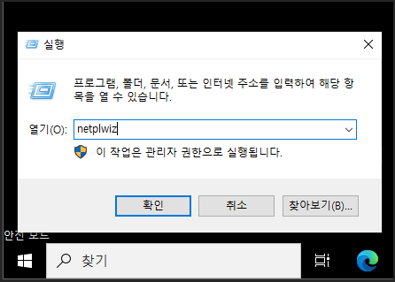 안전 모드로 진입했다면 윈도우 시작 로고 우클릭 후 실행을 클릭합니다. 실행 명령어 입력창에 netplwiz를 입력합니다.