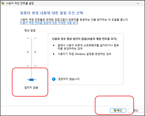 사용자 계정 컨트롤 설정 창이 열리면 좌측의 알림 설정 조절 바를 아래로 끝까지 내립니다. 확인 버튼을 누르고 PC를 재시작하면 이제 경고 창이 열리지 않게 됩니다.