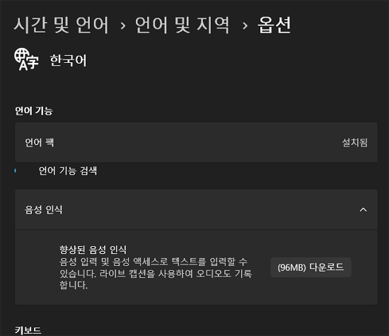 오류 메시지가 나오던 부분에서 추가 언어 팩이나 향상된 음성 인식 부분이 모두 다운로드 가능한 상태로 변경되어 있거나 필요한 추가 언어 팩이 자동 다운로드 및 설치되는지 확인합니다.