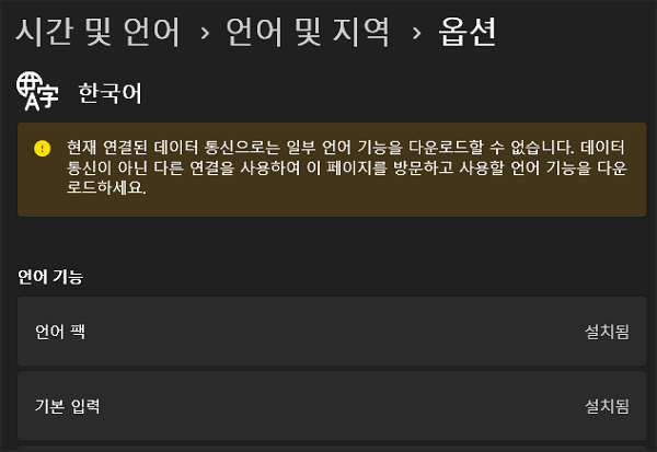 윈도우 11의 시간 및 언어 설정 부분에서 언어 및 지역 옵션 설정에 들어가 보면 한국어 아래로 다음과 같은 오류 메시지가 떠 있는 경우가 있습니다.