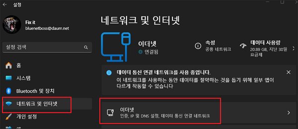 1. 윈도우 설정 > 네트워크 및 인터넷 > 이더넷으로 이동합니다.