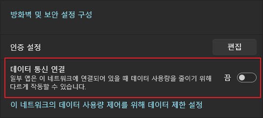 네트워크 및 인터넷 설정 항목을 열면 이더넷 아이콘 아래로 '데이터 통신을 사용 중입니다. 이 네트워크를 사용하는 동안 데이터를 절약하는 것을 돕기 위해 일부 앱이 다르게 작동할 수 있습니다.'라는 메시지를 볼 수 있는 데 바로 이 부분이 불필요한 설정을 하고 있음을 보여주는 부분입니다.