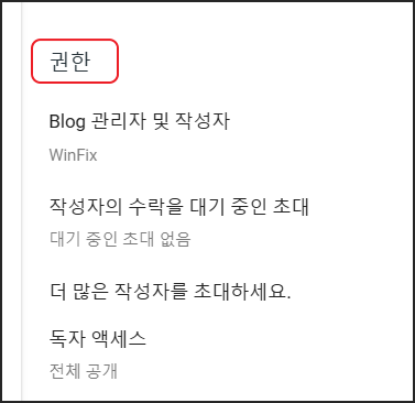 권한 항목에서는 블로그를 누구에게 공개할지 그 범위를 지정할 수 있습니다.