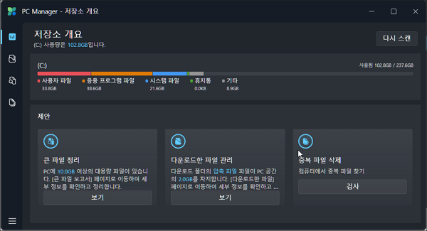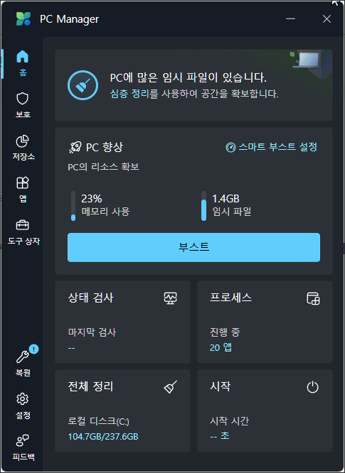 PC 매니저를 처음 실행시킨 화면 구성은 상당히 심플하고 깔끔한 편이며 아래와 같이 생겼습니다.