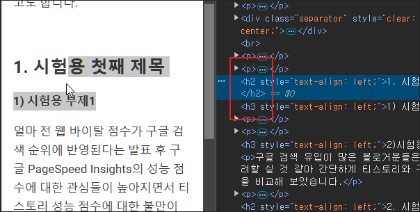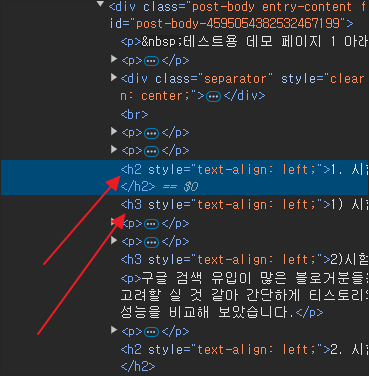 아래의 이미지는 글 내용 중의 제목들 태그를 살펴본 이미지 입니다.