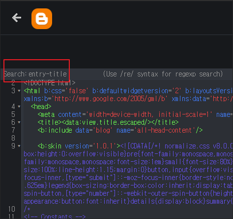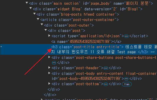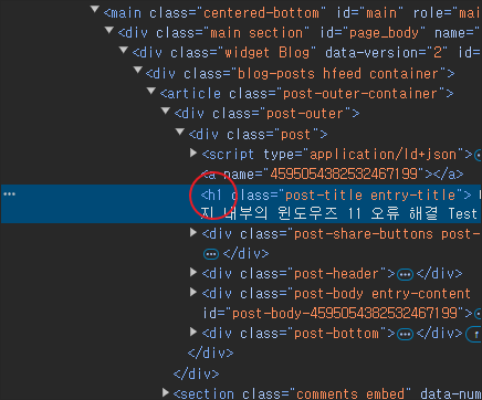 그러면 우측으로 나오는 코드 영역에서 보이듯 기본 블로거 테마들은 제목을 h3 태그로 설정하고 있다는 것을 알 수 있습니다.