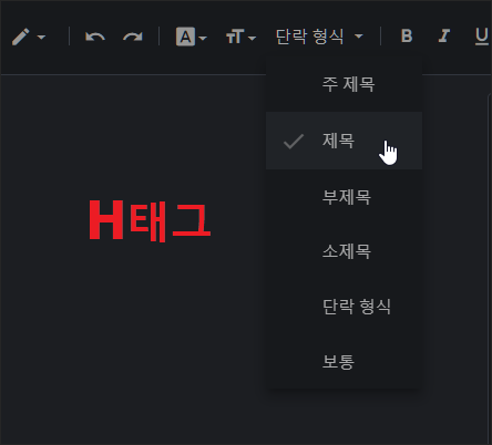 구글 블로그인 블로거로 포스팅하다 보면 다소 헷갈리는 부분이 에디터 상단 메뉴 중 단락 형식을 누르면 나오는 H 태그 중 소 제목들에게 어떤 태그부터 적용해야 할지 잘 모른다는 점입니다. 보통 구글 블로거의 기본 테마들 중 하나를 사용한다면 제목 태그에는 h3가 적용되어 있었습니다. 이 이야기는 포스팅 내용 중 가장 큰 제목은 h4 태그인 소 제목부터 만 사용해야 한다는 결론입니다.