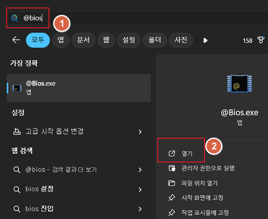 @BIOS 앱의 실행 아이콘을 찾기 어려울 수 있습니다. 실행 아이콘이 보이지 않는 경우에는 윈도우 시작 버튼을 누르고 검색 창에 @bios라고 입력하면 우측으로 @bios.exe 앱이 보입니다. 열기를 클릭합니다.