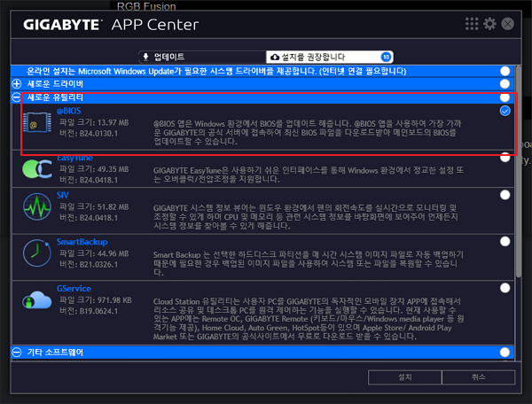 앱센터 화면에서 여러가지가 초기값으로 선택되어 있습니다. 바이오스 업데이트에만 집중하기 위해 모든 체크 표시를 해제하고 @BIOS 앱 한 개만 체크한 다음 하단의 설치 버튼을 눌러 줍니다.