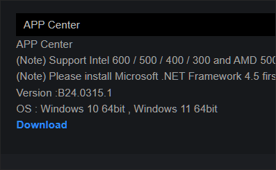 유틸리티 페이지로 이동한 다음 여러가지의 유틸리티 프로그램 목록 중 아래쪽에 위치한 APP CENTER라는 프로그램을 다운로드한 다음 설치합니다.