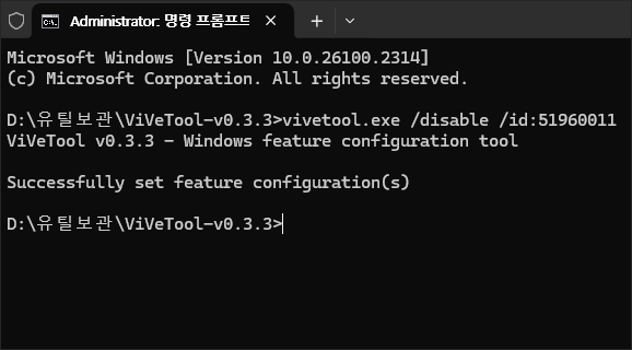 탐색기 옵션 패치가 성공하면 'Successfully set configuration(s)'라는 문구가 출력됩니다. 이 문구가 출력되면 패치가 성공한 것으로 모든 창을 닫고 PC를 재시작하면 됩니다.