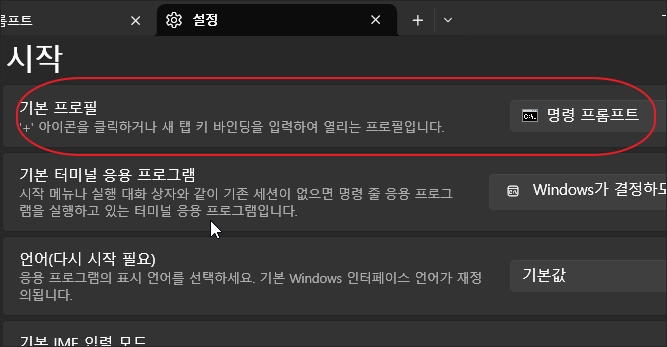 압축을 해제한 폴더를 연 다음 폴더의 빈 공간에서 마우스 우클릭한 다음 터미널에서 열기를 클릭합니다. 그다음 터미널 창의 상단 메뉴 중 설정에서 터미널 창의 기본 시작 프로필을 명령 프롬프트로 변경해 준 다음 터미널 창을 닫습니다.