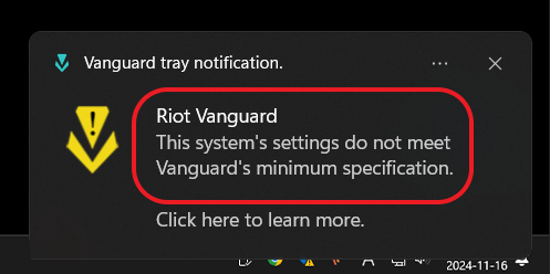 발로란트 실행 중 화면 우측 하단의 알림 창에 'Vanguard tray notification' 오류가 나면서 게임이 종료되는 경우가 있습니다. 오류의 내용은 'Riot Vanguard This system's settings do not meet Vanguard's minimum specification.'입니다.