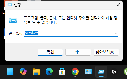 윈도우 시작 로고를 마우스 우클릭 후 실행을 클릭한 다음 netplwiz를 입력합니다.