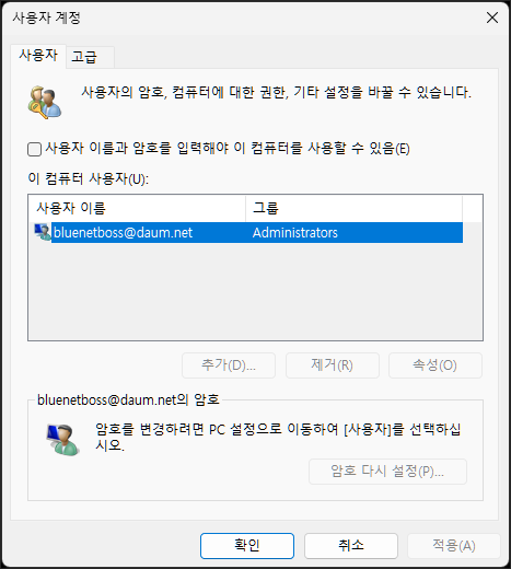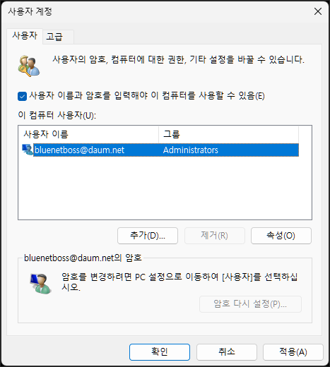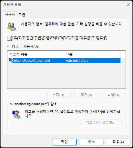 netplwiz가 실행되면 아래의 이미지처럼 적용 버튼이 비활성화되어 있을 수 있습니다.
