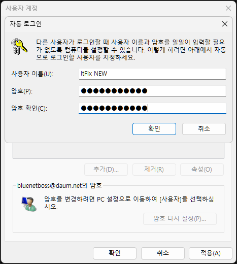 마지막으로 적용 버튼을 누르면 자동 로그인 확인을 위한 암호 확인 팝업 창이 열립니다. 윈도우 MS 계정의 암호를 입력해 주고 확인 및 적용 버튼을 눌러 모두 적용시켜 줍니다.