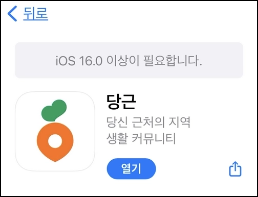 당근 앱의 업데이트를 위해 열기를 누르면 업데이트가 진행되어야 정상이지만 구형 아이폰의 경우에는 ios 16을 지원하지 않아 업데이트가 불가능하며 이전 버전이 현재 업데이트 가능한 최신 버전으로 나옵니다.