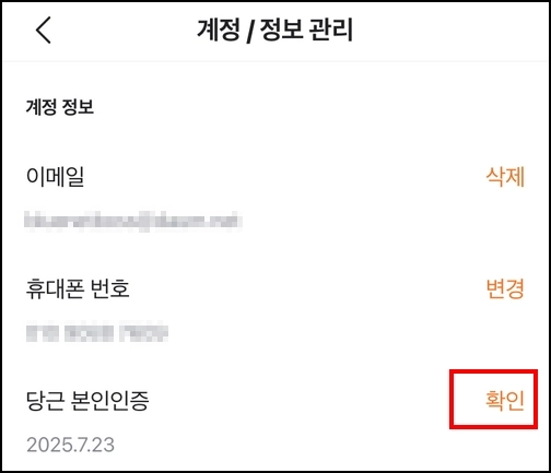 2. 계정 / 정보 관리 항목에서 당근 본인인증 우측의 글씨를 눌러주고 인증 작업을 진행합니다.
