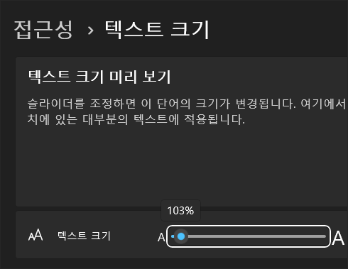 윈도우 설정 > 접근성 > 텍스트 크기로 이동한 다음 키보드의 좌우 화살표를 이동해 자신에게 적합한 텍스트 크기를 찾아봅니다. 언제든지 좌측 끝까지 내리면 기본 100% 크기로 돌아갈 수 있습니다.