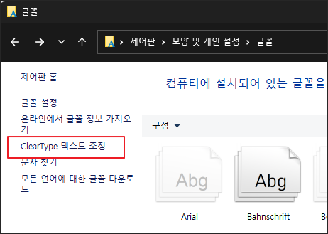 제어판 > 모양 및 개인 설정 > 글꼴 또는 윈도우 설정 > 개인 설정 > 글꼴 > 관련 설정에서 클리어타입 텍스트 조정 과정을 진행합니다. 마법사 형식으로 진행되는 최적의 글꼴타입을 찾는 과정이므로 크게 어려움은 없습니다.