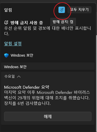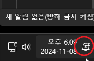 작업 표시줄 시간 표시 옆에 있는 알림 아이콘을 클릭한 다음 상단의 방해 금지 설정 아이콘을 클릭하여 방해 금지 모드를 ON/OFF합니다.