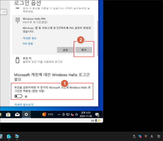 다음으로 로그인 옵션의 Hello 기능과 Pin 번호를 제거해 주어야 합니다. 이 로그인 옵션이 문제를 일으키는 것으로 추측됩니다.