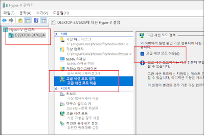하이퍼 관리자 앱에서 메인 PC를 우 클릭하여 Hyper-V 설정을 클릭합니다. 하이퍼 설정에서 고습 세션 모드 정책을 선택하고 허용으로 체크해 줍니다. 만일, 체크되어 있는 데도 문제가 있다면 체크 해제 후 적용 후 다시 원래대로 체크한 다음 적용해 줍니다.
