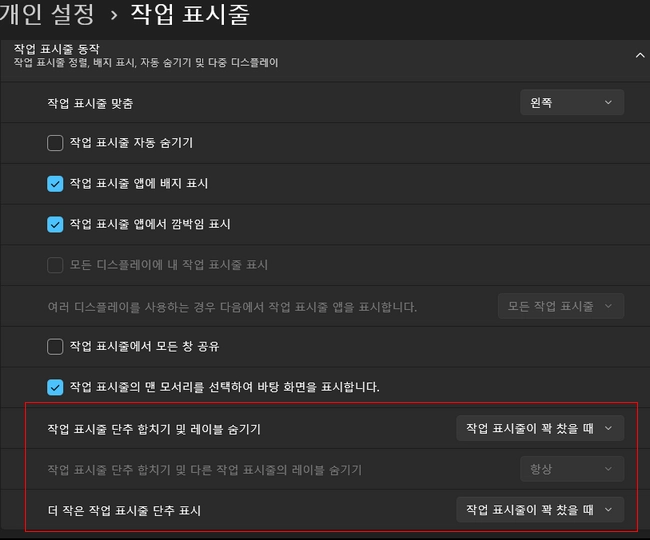 윈도우 작업 표시줄을 마우스 우클릭하여 작업 표시줄 설정에 진입하면 아래쪽으로 작업 표시줄 동작 관련 옵션 설정 항목이 보입니다. 제가 사용 중인 윈도우 11 프로 64비트 24H2 OS 빌드 26100.4770 버전의 경우에 레이블 및 단추 관련 옵션이 모두 정상적으로 작동하고 있습니다.