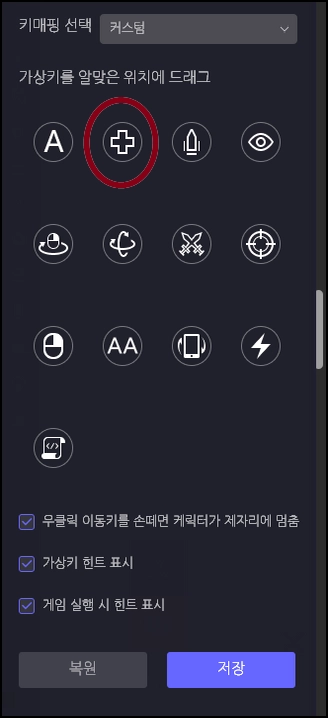 나타난 옵션 창에서 플러스 모양의 이동키 아이콘을 마우스로 드래그하여 게임 실행 화면의 우측 하단으로 드래그하여 이동 배치합니다. 적당한 위치로 이동시켜 놓았다면 저장을 눌러 줍니다.