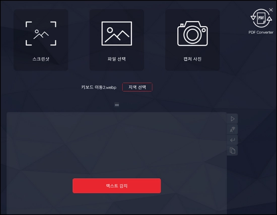 어두운 모드와 밝은 모드 중 선택하여 작업할 수 있으며, 할 일은 이미지를 선택한 다음 텍스트 감지 버튼을 한번 누르는 것 이외엔 다른 할 일은 없습니다.