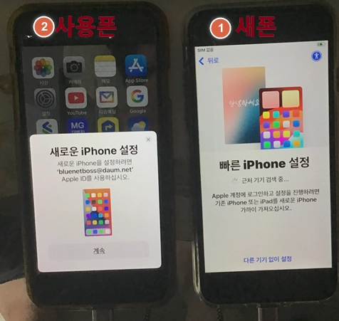 두 기계를 나란히 놔둔 다음 새폰을 초기화하고 다시 시작한 다음 새 폰의 아이폰 언어 설정을 끝내면 바로 빠른 설정 화면이 들어옵니다. 이때 자동으로 사용폰에서도 인식하고 새로운 설정 화면이 뜨게 됩니다.