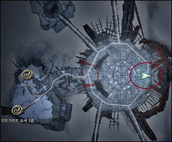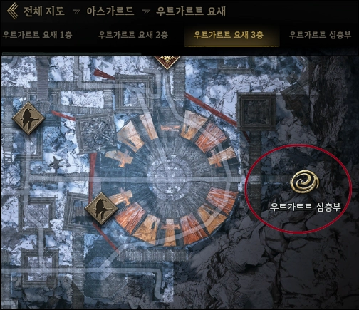 검은 발자국의 전제 조건을 모두 완료하셨다면 아스가르드>우트가르트 요새 3층을 통해 우트가르트 심층부로 이동합니다.