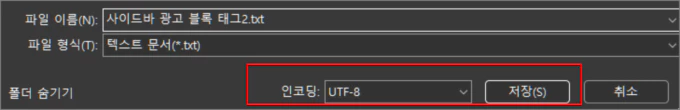 위와 같은 방법으로 문서가 제대로 열렸다면 빈 공간에 스페이스바를 한번 눌러 주는 등의 약간의 변화만 주고 다른 이름으로 저장하기를 누른 다음 파일명을 변경하고 저장은 utf-8로 저장합니다. 이렇게 한 다음 다른 이름으로 저장된 파일을 사용하면 언제나 깨지는 문제가 해결된 상태의 텍스트 문서가 열리게 됩니다.