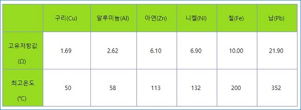 이때, 도체중 전기절연선으로 구리가 많이 쓰이는 이유는 아래의 금속 고유의 전기저항값과 금속에 전류가 흐를때 발생하는 최고온도의 상관관계를 보면 구리가 도선에 많이 쓰이는 이유가 납득이 가게 됩니다.