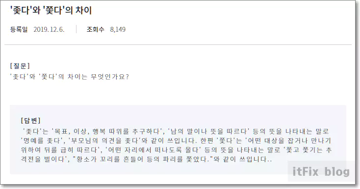 아래의 이미지는 국립국어원의 질의 문답 사례중에 있는 문답 사례인데, 국립국어원도 '좇다'는 이상이나 행복, 가치 등을 따른다는 의미로 해석하며, '쫓다'의 경우는 실제 현실에서의 물리적 거리이동이나 움직임을 기준으로 하는 것으로 보입니다.