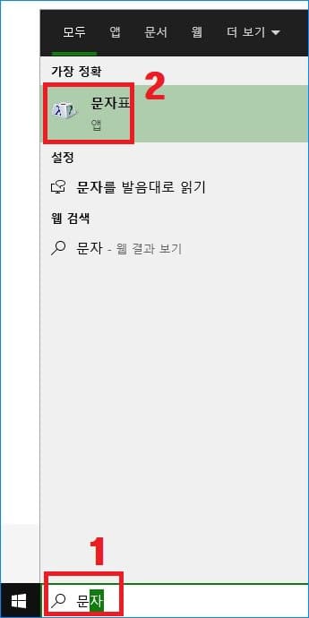 2. 윈도우즈 시작버튼 옆의 검색창에 '문자표' 입력